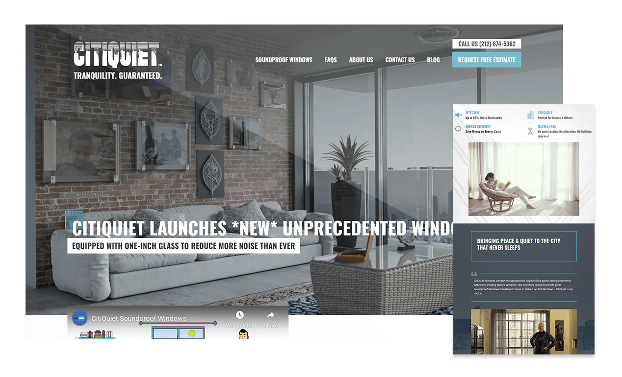 Ironically, CitiQuiet’s website had so much content, users weren’t able to get the message. On the homepage of the original website was a video that gave a (not-so) brief explanation of CitiQuiet’s history, product, guarantees, and testimonials. First things first, the team cut down the length of the video and pulled out the best stories that highlighted the most relatable customers and settings, so that anyone watching could visualize Sound Proof Windows in their life. We created icons to make the data and product specs easier to digest, and used typography to create visual hierarchy for the most important information.