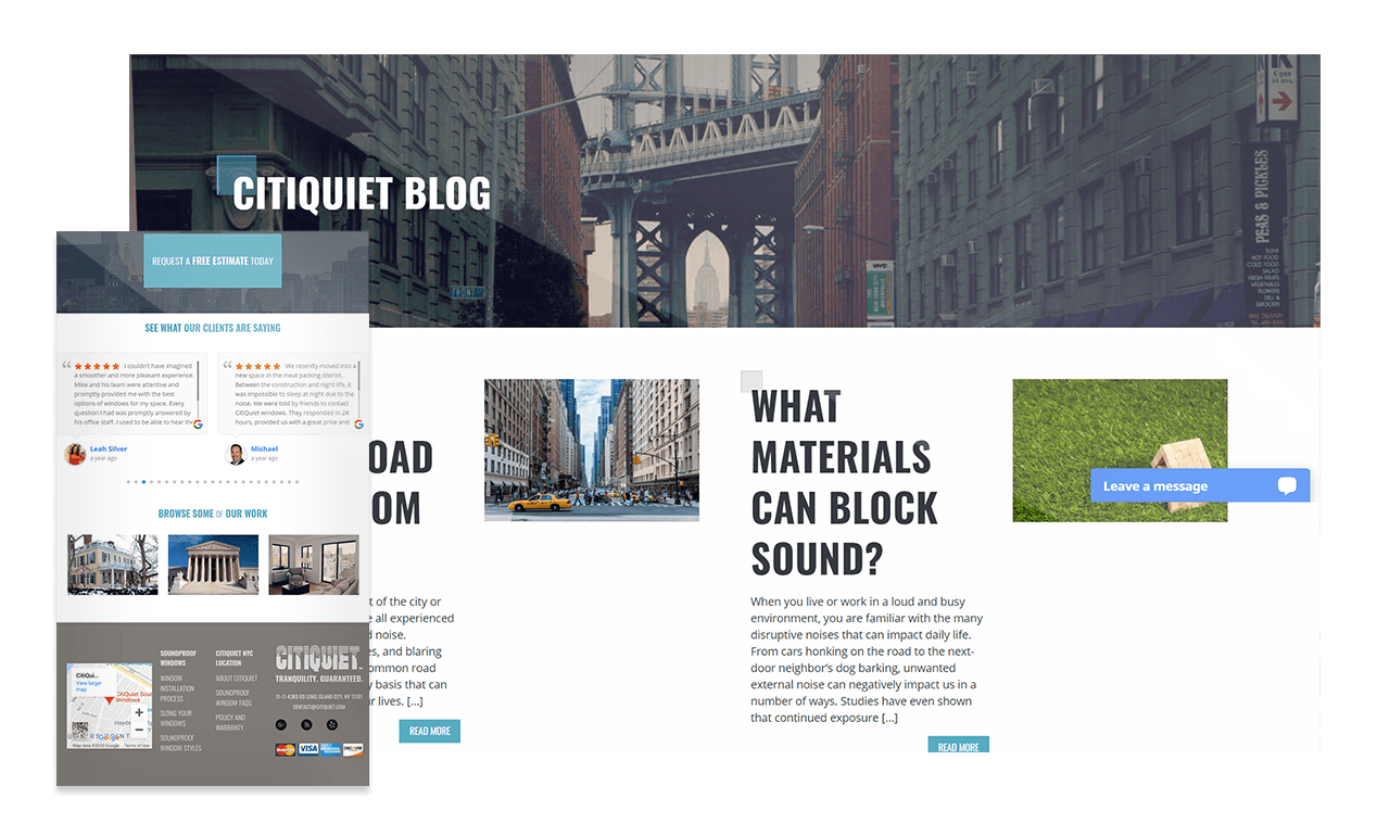 While it’s great that CitiQuiet has so much information for curious website visitors, it’s important to make the information easy to quickly digest, or else the message will be skipped altogether. That’s why the team worked to strategically adjust the hierarchy and make sure that the most important tidbits were noticed first. We made it easy to have specific questions answered as well as get personalized information or quotes through direct contact by placing their contact information at the top of the screen.