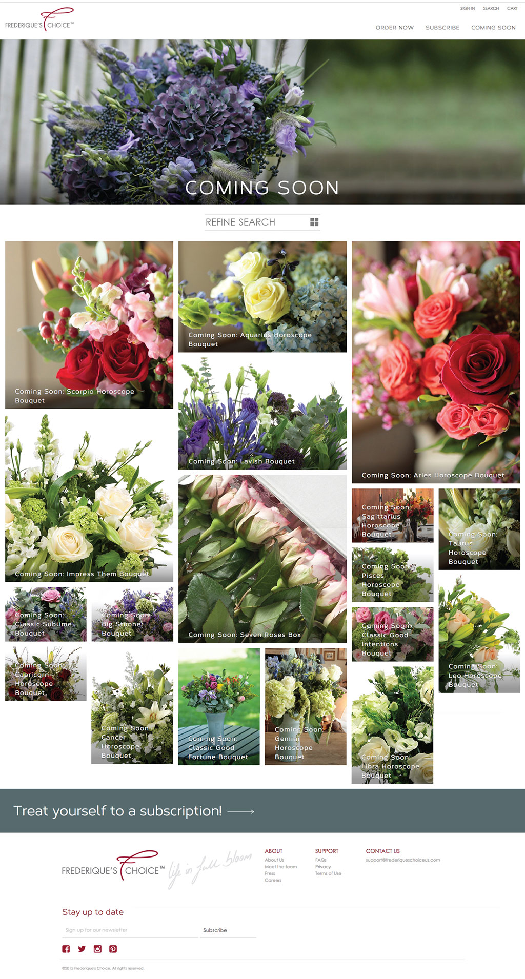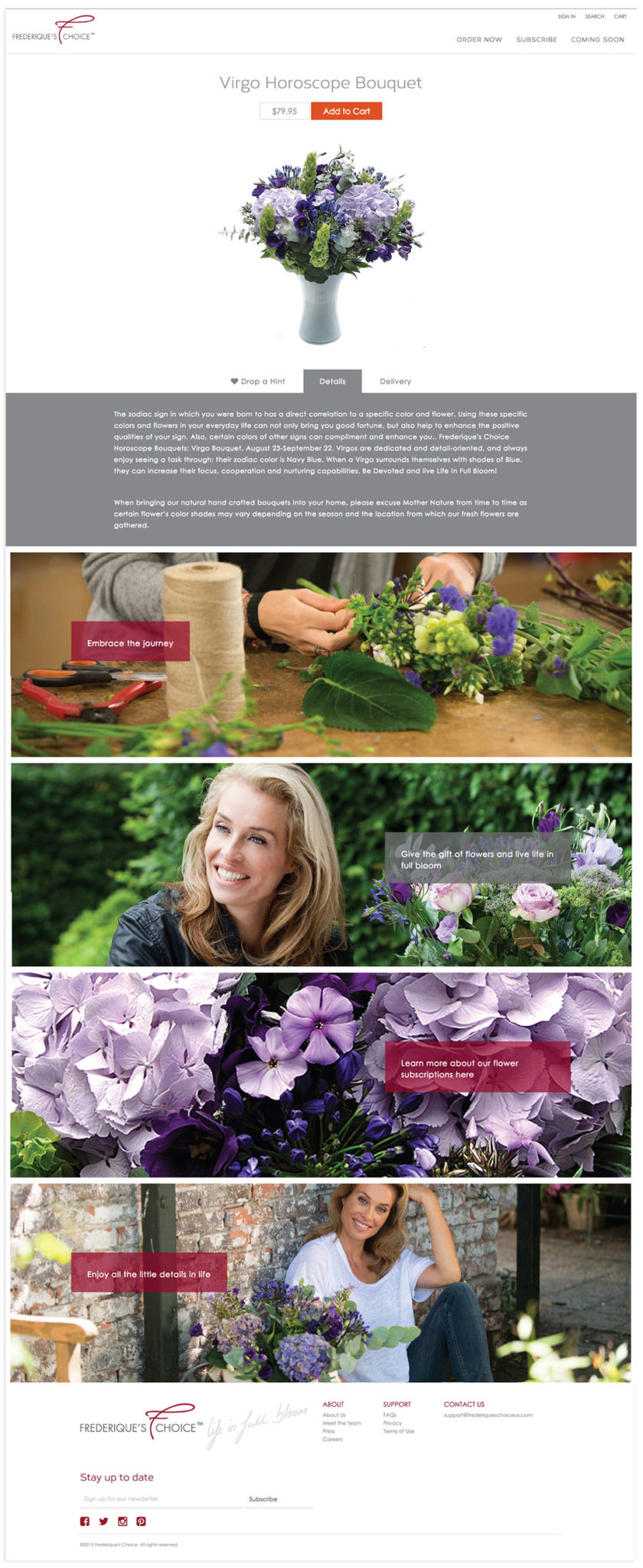 Based in Tribeca and led by CEO Heidi Diamond, Frederique’s US team was determined to avoid two potential traps—one, settling for a “safe” but uninspired flower delivery site, with dozens of thumbnail images offering similar arrangements for every occasion, and two, ending up with either a generic celebrity-based lifestyle site or one with a motif reminiscent of Martha Stewart Living.